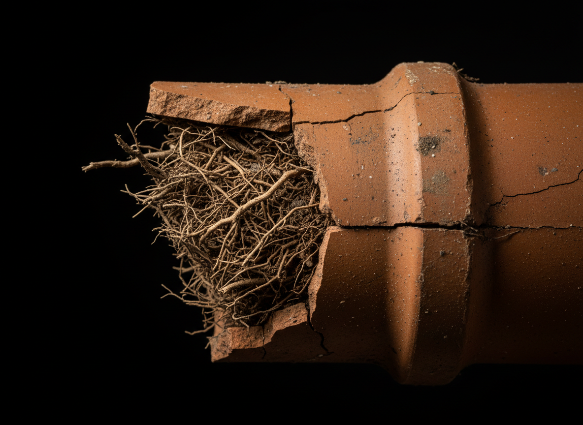 Tree roots penetrate through cracks and joints, causing severe blockages and structural damage to deteriorating clay pipes.